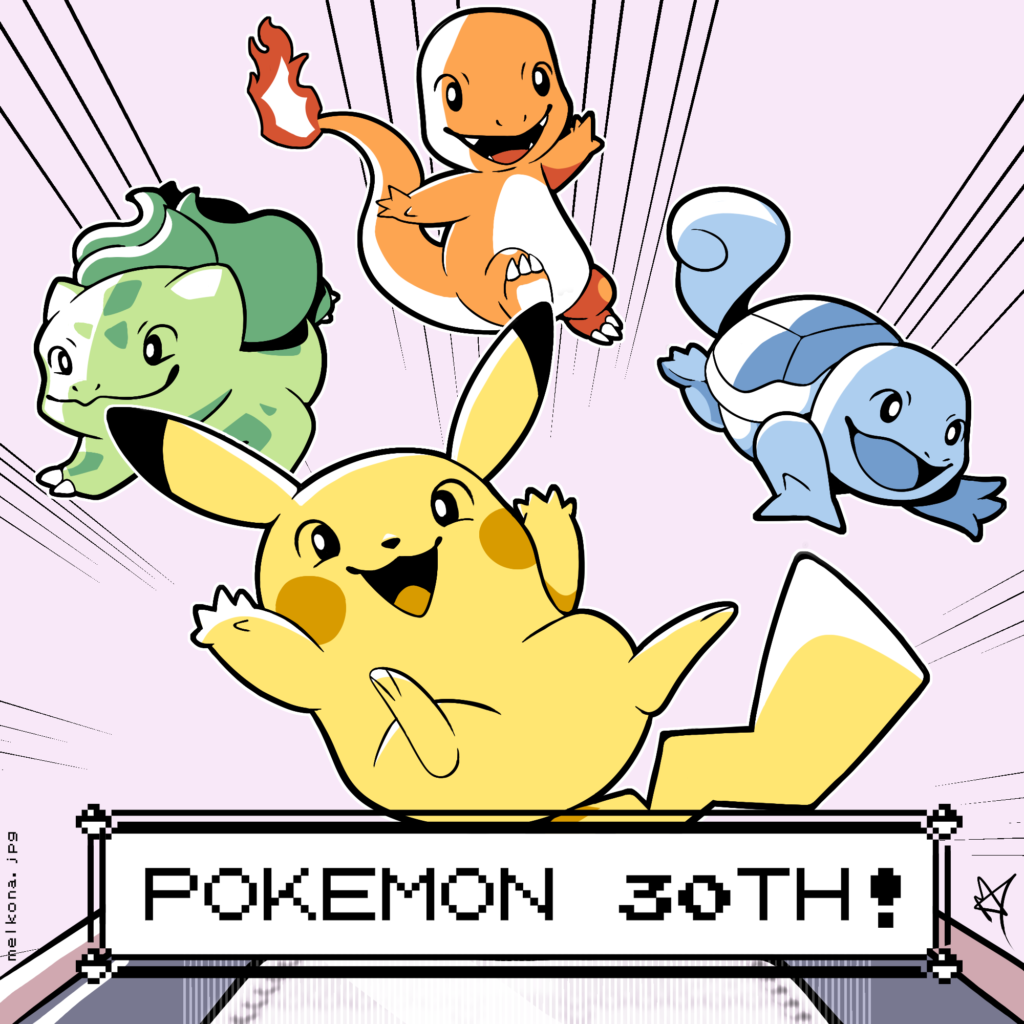 Najlepszego z okazji 30 rocznicy dla Pokemonów, dziękuję za bycie tak wielką częścią mojego życia przez tak długi czas. Z niecierpliwością oczekuję co szykujecie dalej, co jeszcze macie w zanadrzu! Ciężko uwierzyć, że to uniwersum ma już 30 lat – i gdzieś tam pomiędzy nimi, przez większość tych lat jestem gdzieś ja. Poprzez gry, mangę i anime, aż do karcianki, rysunków i wielu innych różnorodnych kolekcji. Wciąż na miejscu, wciąż z niekończącym się uwielbieniem i pasją do tego szerokiego uniwersum. Wciąż z dorocznym artem okolicznościowym!